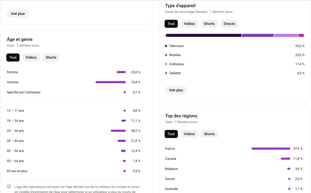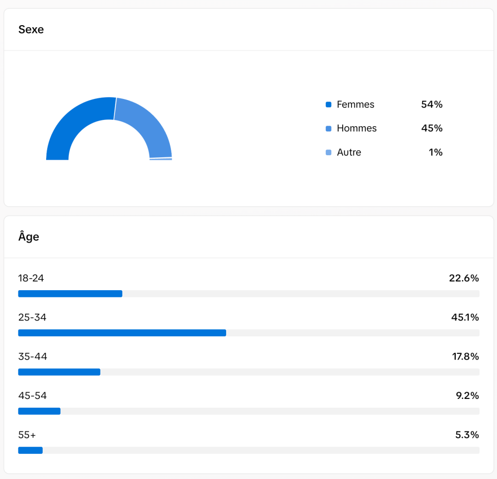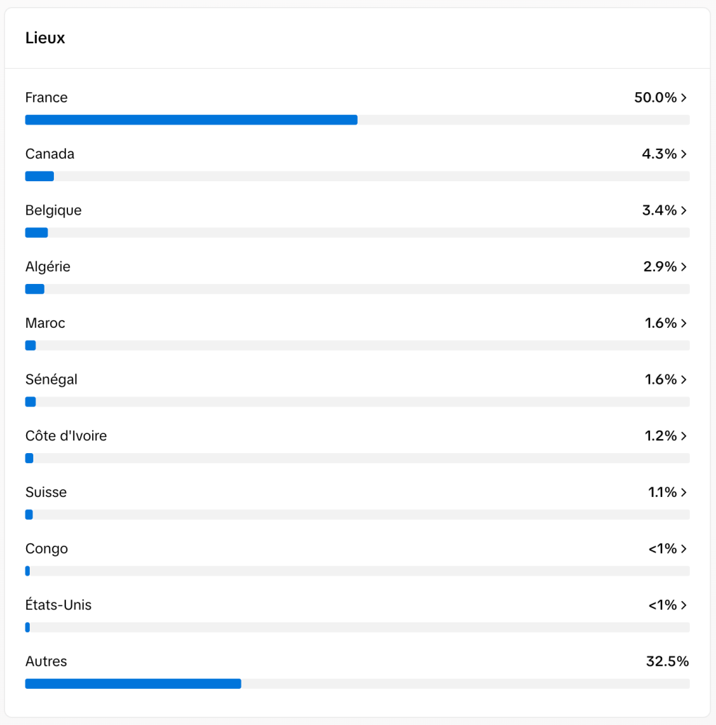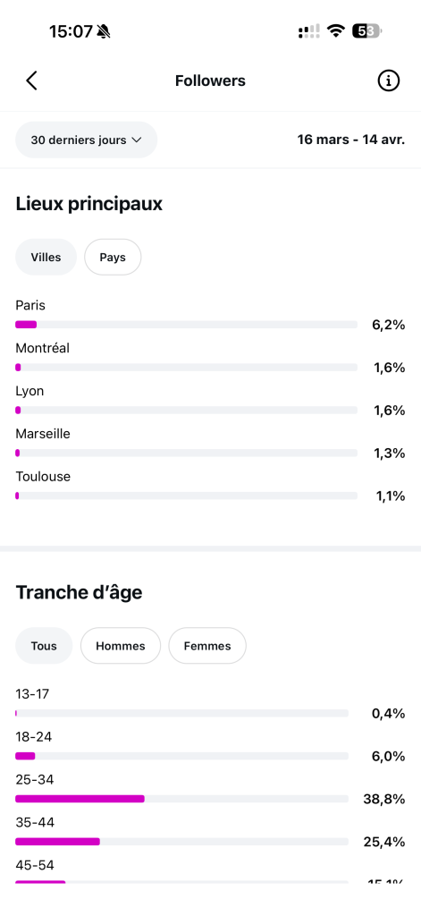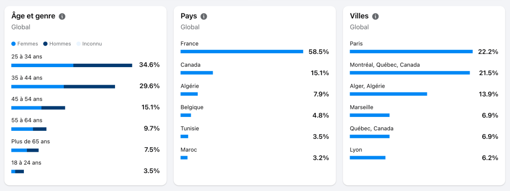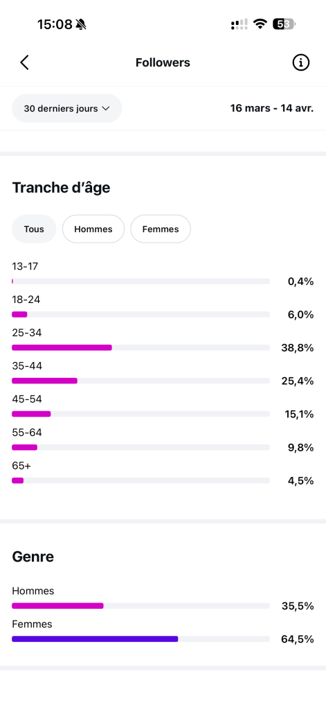 Comme vous pouvez le voir, mon coeur de cible reste les 25-54 francophones, qui représentent plus de 2/3 des abonnés sur ce réseau.