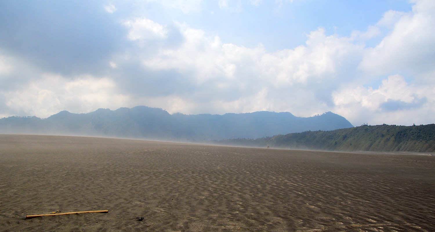 Sur la route, les paysages sont beaux et surtout très différents. On traverse des villes, des villages en montagne pour finir sur un paysage assez particulier… En effet, l’arrivée au Mont Bromo est lunaire. On découvre une étendue de sable noir sans végétation avec le Mont Bromo en activité en arrière plan. La jeep se lance dans cette mer de sable noir ou la poussière vole dans tous les sens. Nous apercevons au loin le mont, impressionnant.