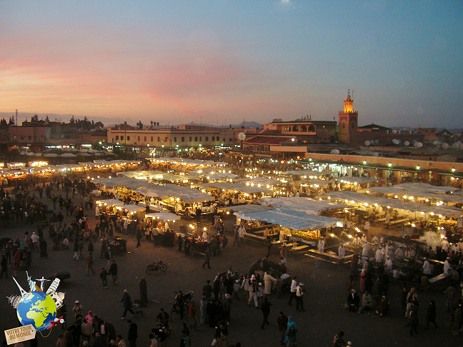 La place Jemaa El-Fna est sans aucun doute l’endroit le plus animé de la ville, scène de théâtre permanente, la place a de quoi fasciner, de jour comme de nuit. Le matin c’est l’heure des boutiquiers, l’heure de la criée, des emplettes, du commerce. Le marché se met en place et les bancs deviennent une palette extraordinaire, une cascade de fruits et de légumes est installée dans tous les coins, on y trouve de tout. Dattes, oranges, bananes, abricots, pêches, prunes, pastèques, tomates, pamplemousses mais aussi des milliers d’épices.  L’après-midi, Jemaa El-Fna se transforme en une grande scène de théâtre, place aux charmeurs de serpents, aux musiciens, aux conteurs et aux acrobates. A la nuit tombée, la place devient noire de monde et se transforme en un immense restaurant en plein air. Plus qu’une place, Jemaa El-Fna est un mythe qu’il faut voir, écouter, sentir.
