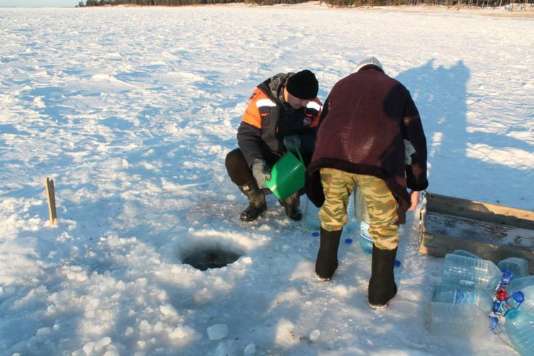 Le lendemain matin, petite gueule de bois mais quoi de mieux pour s’en remettre : balade en forêt par –30°C. Certains amis rencontrés la veille proposent d’aller pêcher sur la glace avec le père de l’un d’eux : Serguei, un vrai sibérien. Après une longue marche dans la forêt nous sommes arrivés au lac où nous avons pris pas mal de temps pour pêcher avec les explications théoriques et pratiques pour faire un trou dans la glace (sans qu’elle ne se brise autour !). Finalement ce fut une superbe expérience.