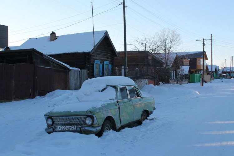 Après cette belle halte, j’ai fait un détour plus au nord sur la rive est du Baïkal à Goriatchinsk, petit village perdu dans les forêts de sapins à quelques heures de Mashroutka depuis Ulan-Ude. Ici on fait un bond de 50 ans en arrière : le temps semble s’être arrêté : des ruelles vides, beaucoup de chiens errants, des voitures sibériennes recouvertes de neiges, des petites maisons en bois… J’ai pourtant adoré ce décor ! J’en ai profité pour faire pas mal de photos, et aller explorer les rives du Baïkal, et même marcher sur le lac. Je n’aurais peut-être pas dû à certains endroits, car j’ai failli y rester : après avoir observé des pêcheurs sur glace, je me suis dirigé plus à l’ouest, et au retour, j’ai senti que la glace se craquelait autour de moi. J’ai gardé mon calme et j’ai marché doucement afin de ne pas briser la glace… alors que je me trouvais à 50 m du rivage. Au final plus de peur que de mal, mais j’ai eu une bonne frousse. J’ai compris que la température n’était pas assez basse (seulement –20°C) et comme l’eau ne stagne pas…