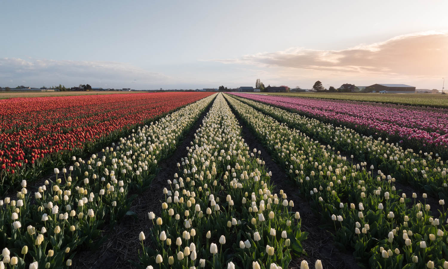 Ici j’ai utilisé les lignes directrices formées par les champs de tulipes pour donner une impression d’infini à la photo. Les champs semblent ainsi s’étendre à perte de vue :