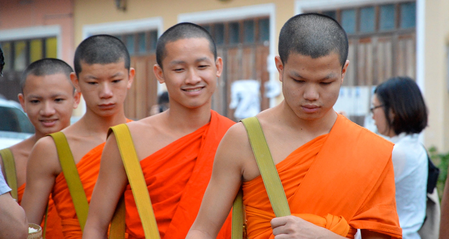 Il faut se lever à 5h00 pour assister à ce moment unique de la journée. Au petit matin, les moines vont faire l’aumône auprès des fidèles. Ils défilent dans la rue et les habitants leur donnent à manger (des boulettes de riz, des légumes et des fruits). Parmi les fidèles, les touristes affluent aussi. C’est un moment de silence qui doit se respecter. On peut faire une offrande aux moines tout en respectant certaines règles. Il faut s‘asseoir et avoir une écharpe sur son épaule gauche. Les femmes ne doivent pas regarder les moines et les épaules et jambes doivent être couvertes. Ce moment est incroyable, car tous les moines sortent en même temps dans un silence total.