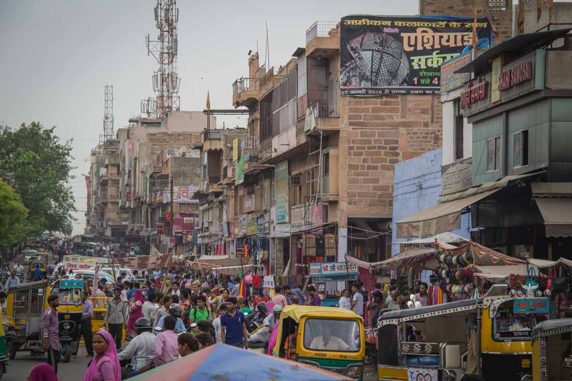 Nous sommes arrivés à Jodhpur. Cette ville est surnommée la «ville bleue» en raison des façades peintes des maisons de la vieille ville. Encore une fois, le Fort de Mehrangarh domine la cité et offre une vue sur les façades peintes superbes. Après l’avoir visité, nous nous rendons au Sardar Bazar situé autour de la Tour de l’Horloge. Très vite nous nous éloignons de l’agitation du marché pour aller dans les rues de la vieille ville à la traque aux maisons bleues (car oui, je suis désolé, toutes les maisons de la vieille ville ne sont pas bleues !). Nous sommes rapidement perdus. Marcher loin de l’agitation et des lieux touristiques, découvrir la vie des locaux, est, je crois, ce que je préfère faire en voyage. Regarder les vieux messieurs jouer aux cartes entre amis, marcher jusqu’à tomber face à un énorme puit à degrés appelé «Bâoli» en Hindi ou encore face à une salle de musculation et de combats où un papi travaille ses bras. Jodhpur est une ville très agréable. Plus nous allons dans la campagne, plus les habitants sont souriants et accueillants. De moins en moins de regards «dérangeants» sont portés sur nous.Pour se déplacer d’une ville à une autre, de nombreuses heures de bus sont obligatoires. Les trajets peuvent aller de 3 heures jusqu’à 7 heures de route. J’aime ces moments. Au fur et à mesure des kilomètres, je vois les paysages changer. La faune, le relief, l’architecture, les villes mais aussi leurs habitants. C’est comme si je voyais l’Inde défiler sous mes yeux.