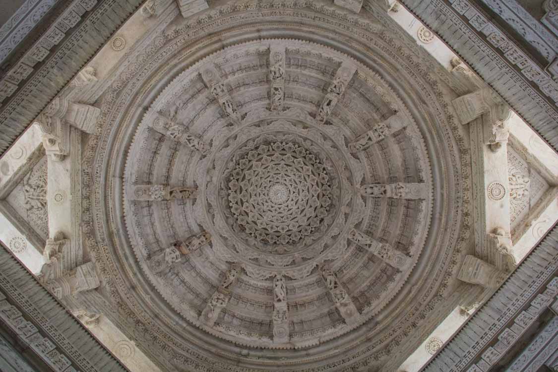 Et justement ! Direction Udaipur, nous changeons radicalement de décor. Nous passons d’un environnement assez désertique, sans trop de relief, à celui de plus en plus tropical avec de plus en plus de collines. Ce sont les Aravalli, chaîne de montagnes qui traversent l’Etat du Rajasthan. Décidément, le Rajasthan nous en fait voir de toutes les couleurs !Sur le chemin nous nous arrêtons avant de commencer à grimper les montagnes à Ranakpur. C’est perdu dans la forêt que se trouve le temple Jaïn le plus important, celui d’Adinatha. Il est formé de 29 salles et il est censé compter un total de 1444 piliers. C’est l’une des plus belles et plus vastes constructions Jaïns de l’Inde. Il est construit en marbre blanc dont chaque centimètre est gravé et sculpté.